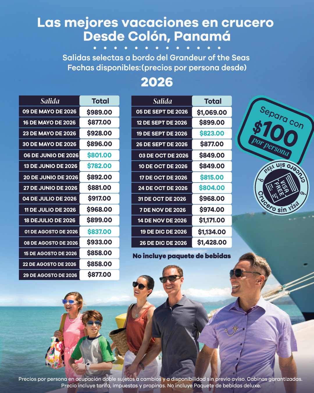 Embarque en Reykjavik, Islandia y desembarque en Southampton, Inglaterra a bordo del Nuevo Barco, Norwegian PRIMA Crucero de 10 días recorriendo desde Islandia, Noruega, Holanda, Bélgica, hasta Inglaterra. Del 5 al 15 de septiembre de 2024 El Precio Incluye Crucero en cabina seleccionada con impuestos y propinas. Todas las comidas en restaurantes principales del barco. 35% de descuento Ya aplicado a todos los precios Válido por tiempo limitado. Aplica a la promoción de Verano “Free At Sea” Válido por tiempo limitado. La naviera actualiza los precios a diario, por lo tanto, están sujetos a cambio al momento de reservar. RUTA Cotizar Precios Tentativos por Cabina según cantidad de Personas Cabina Studio Total para 1 sola persona en Cabina Studio desde $3,398 Cotizar Cabina Interna Total para 2 personas en Cabina Interna desde $5,225 Total para 3 personas en Cabina Interna desde $5,992 Total para 4 personas en Cabina Interna desde $6,619 Cotizar Cabina con Ventana Total para 2 personas en Cabina con Ventana desde $6,324 Total para 3 personas en Cabina con Ventana desde $7,092 Total para 4 personas en Cabina con Ventana desde $7,719 Cotizar Cabina con Balcón Total para 2 personas en Cabina con Balcón desde $7,025 Total […]